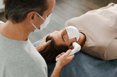 Sujet assis puis debout, les pieds joints et les yeux ouverts. Mettre le vovafon en position 100Hz et puissance maximale avec la tête ronde (ou plate). Déplacer le Novafon de l'occiput à la base de la nuque en appuyant un peu.