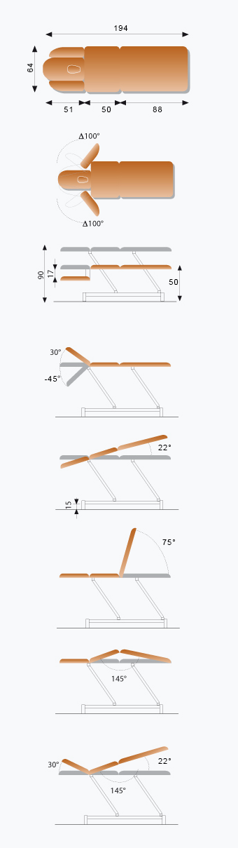 Vos soins thérapeutiques seront encore plus performants avec le plateau distal qui peut se relever jusqu'à 70° pour mettre les jambes en flexion, le plateau central qui permet la mise en cyphose jusqu'à 22° et la têtière que vous pouvez placer entre -45° et + 30° . La table électrique Cezanne vous assure toutes les combinaisons possibles.
